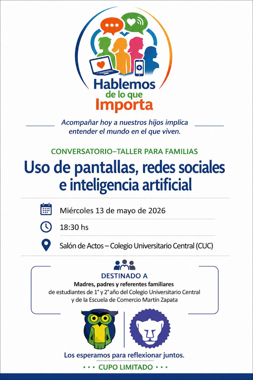 En el marco del proyecto institucional “Hablemos de lo que importa”, el Colegio Universitario Central y la Escuela de Comercio Martín Zapata invitan a madres, padres y referentes familiares de estudiantes de 1° y 2° año a participar del conversatorio-taller “Uso de pantallas, redes sociales e inteligencia artificial”.
